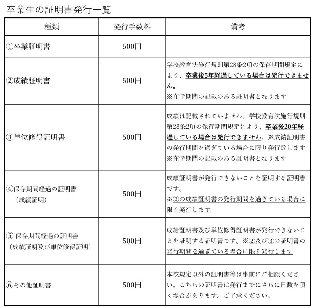 卒業生本人が学校窓口にて証明書発行申請書に記入提出のうえ、発行手数料を現金でお支払いください。本校規定の証明書を窓口にて申請された場合、原則として申請日の翌日に発行致しますので、後日窓口にお越しいただき証明書をお受け取り下さい。(土日祝日前申請の場合は、翌開校日)本校規定外の証明書に関してはお時間を頂きます。なお、本人確認のため顔写真付きの身分証明書を窓口で提示してください。(運転免許証、マイナンバーカード、パスポート等)